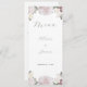 Fügen Sie diese elegante Rosengarten Hochzeitsmenü-Karte zu Ihrem Empfang Zubehör hinzu. Der Titeltext ist mit weichen rosa Rosenknospen und grünen Akzenten gestaltet und beinhaltet: The Bride and Groom's Names and Wedding Date. Der Reverse-Text beinhaltet: Ihre Essensauswahl: Appetizer, Entre und Dessert, auf weißem Hintergrund. Zum Personalisieren fügen Sie einfach Ihren Text in unsere einfache Vorlage ein und ersetzen den Beispieltext.