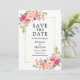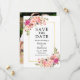 Die elegante Watercolor Rosa Blush Bloral Save the Date Verlobung Wedding Announcement Card beinhaltet rosa Rosen und botanisches Grün auf einem goldenen Rahmen. Foto zurück.