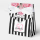 Ein Gefälligkeitskasten für eine 50. Geburtstagsfeier, ganz gleich, welches Alter Sie haben. Klassische schwarz-weiße Streifen als Hintergrund. Mit mädchenhaften, rosa Blume, Rose als Dekoration. Mit dem Text: Danke! Ein schwarz-weißer Rahmen vorne mit Vorlage für Alter, Name und Datum. Alter Nummer 50 in Rosa, Name und Datum in schwarz. Der Name wird mit einem handgeschriebenen Stilskript geschrieben.