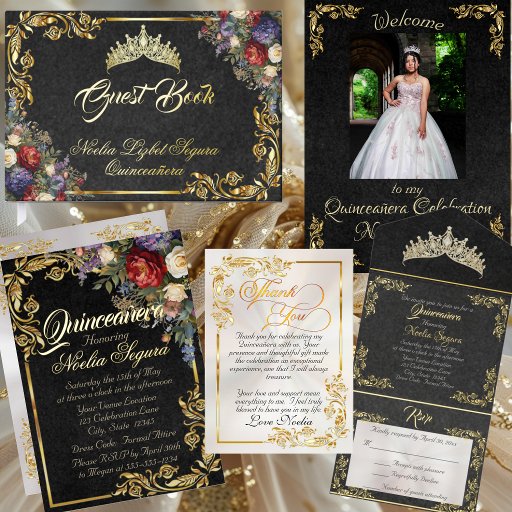Floral & Gold Leaves - Black & Pearl QuinceneraDesignt von Beth Harsh