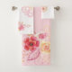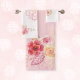 Umgestalten Sie Ihr Bad in eine Oase der Romantik und des Luxus mit unserem Blumenhandtuch-Set in Rosa, mit Aquarellfarben-Rose in Rosa und Gelb, aufwändigen Spitzen-Doilien und einer Touch zeitloser Eleganz mit Perlen.