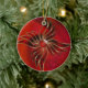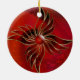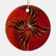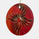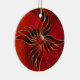 Ein abstraktes Werk in feurigen Rot und Gold. Ein deutliches rotes Juwel ist von goldfarbenen Flammen umgeben, die mit glitzernden Rubinen und gelben Sternexplosionen geschmückt sind. Die wirbelnden, spiralisierenden Fraktale im Hintergrund erscheinen in tieferen Farbtönen im goldenen Filigree des Flammenmotivs.