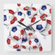 Diese Fußball-Wanduhr zeigt das Bild eines Clusters verschiedener Größen von rot, blau und weiß Fußballbällen - angepasst an den Namen des Athleten - von katz_d_zynes