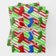 Dieses lustige, festliche Weihnachtsthema Umhüllungspapier Design zeigt verschiedene Muster von grünen, weißen und roten Streifen, zusammen mit rot, blau und grün Vorstellungen von Weihnachtsfeiertagen Strumpf. Umhüllungspapier wie dieses kann verwendet werden, wenn Geschenke umhüllt werden, die in der Weihnachtsfeier gegeben werden.