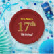 Dieses einfache, personalisierte, geburtsthematische Papierplattendesign enthält eine anpassbare Nachricht wie "17. Geburtstag des Vornamens!", wo der Name geändert werden kann, und das "17." hat ein goldfarbenes Imitat/Imitation. Es hat auch einen roten Hintergrund. Teller wie diese könnten vielleicht in einem Party zur Feier des siebzehnten Geburtstages von jemandem benutzt werden. [~Z0000144]