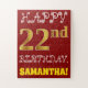 Dieses lustige und einfache Geburtstagsrätsel-Design beinhaltet die Meldung "HAPPY 22. BIRTHDAY", mit dem "22." ein Imitat/Imitation goldfarbigen Aussehen. Es enthält auch einen benutzerdefinierten Namen und einen roten Hintergrund. Es könnte eine lustige und besondere Art sein, jemandem, der seinen 22. Geburtstag feiert, einen personalisierten Geburtstag zu schenken. [~Z0000200]
