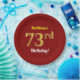 Dieses einfache, maßgeschneiderte, geburtsorientierte Papier-Plattendesign enthält eine anpassbare Nachricht wie "FirstName’s 73. Birthday!", wo der Name geändert werden kann, und die "73." hat ein goldfarbenes Imitat/Imitation. Es hat auch einen roten Hintergrund. Teller wie diese könnten vielleicht in einem Party zum Feiern des dreiundsiebzigsten Geburtstages von jemandem benutzt werden. [~Z0000144]
