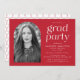 Wir laden Sie ein zu Ihrer Abschlussfeier mit unserer schicken Foto-Abschlussfeier. Die stilvolle Graduierungsparty lädt mit dem Foto des Absolventen ein, das durch einen roten bogenförmigen Rahmen gerahmt ist. "Grad Party" wird in weißer, modernisierter Schrift dargestellt. Personalisieren Sie die Front der trendy Graduation Party einladen, indem Sie den Namen des Absolventen, die Schule, Abschluss Jahr und Party Details. Die Einladung kehrt sich um, um ein weißes und rotes Kreismuster anzuzeigen.