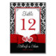 Diese romantische zweiseitige, schwarz-weiße Damast-Hochzeitskarte hat ein Bild von einem Herzpaar, das über einem roten Band und einem Bogen-Bild über dem unteren Teil der Tischnummer liegt. Die Tischnummer, die Namen der Braut und des Bräutigams sowie das Hochzeitstag sind auf beiden Seiten in Schwarz, Weiß und Rot gedruckt. **SIE MÜSSEN DIE NUMMER AUF DER KARTE FÜR JEDE BENÖTIGTE NUMMER ÄNDERN, SIE IN IHRE KARTE HINZUFÜGEN, DANN ZURÜCKKEHREN UND DEN PROZESS FÜR JEDE BENÖTIGTE NUMMER WIEDERHOLEN. Wenn Sie weitere passende Artikel benötigen, schicken Sie Ihre Anfrage bitte an niteowlstudio@gmail.com oder nutzen Sie die Zazzle-Chat-Funktion, um die Touch zu erhalten.