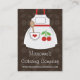 Eine niedliche und retro Artgeschäftskarte mit einer roten und weißen Schürze mit einem Herzen auf seiner Tasche, einem Kirschappliqueentwurf und hölzernem Löffel auf einem doppelten Kirsch- und Gänseblümchenton auf Hintergrund des dunklen Brauns des Tones. Diese Karten des persönlichen Geschäfts sind für einen Bäcker, einen Koch, einen Koch, eine Bäckerei oder eine Cateringfirma perfekt. Fertigen Sie ihn besonders an, um zu sagen, was auch immer Sie auf dem hinteren und das vorder von der Karte wollen. Grafik © Chrissy H. Studios, LLC. Alle Rechte vorbehalten.