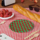 Abstrakte digitale Kunst von roten und grünen Quadraten in einer karierten Formation. Mit der Möglichkeit, die rosa Quadrate zu ändern, indem Sie die Hintergrundfarbe so ändern, dass sie den roten Quadraten entspricht.