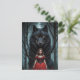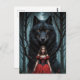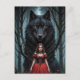 AI generierte dunkle Fantasiekunst von Red Riding Hood in einem schwarzen und roten Kleid und einem riesigen schwarzen Schutzwolf, der sie beobachtet und vor Schaden im dunklen Wald schützt.