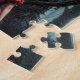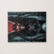 AI generierte dunkle Fantasiekunst von Red Riding Hood in einem schwarzen und roten Kleid und einem riesigen schwarzen Schutzwolf, der sie beobachtet und vor Schaden im dunklen Wald schützt.