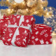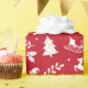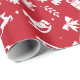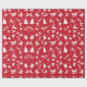 Ein rotes Verpackungspapier mit einem weißen Weihnachtsmuster, mit Weihnachtsbäumen, Rentieren, Geschenken, Schneeflocken, Sternen, Bögen, Schaukelpferden, Schlitten, heiligen Blätter, Glocken, Ästen und Weihnachtsmannmützen.