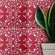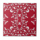 Diese Keramik-Kachel weist einen reichen, tiefroten Hintergrund auf, der als auffallender Kontrast zum verzierten weißen Muster dient. Das Hauptmotiv des Designs ist eine symmetrische, längliche Rautenform, die auch als stilisierte Darstellung einer Blume oder eines Blattes interpretiert werden kann. Diese zentrale Figur ist umgeben von wirbelnden, rebenartigen Mustern mit Blattmotiven, die dem Gesamtbild ein Gefühl von Bewegung und Eleganz verleihen. Die Ecken der Kachel sind nicht nackt verlassen, sondern mit zusätzlichen dekorativen Elementen geschmückt, die zur komplexen Ästhetik der Kachel beitragen. Der krasse Farbkontrast zwischen dem weißen Muster und dem roten Hintergrund hebt jedes Detail hervor, was die Komplexität und Handwerkskunst des Designs hervorhebt.