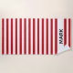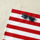 Ein auffälliges gestreiftes Strandtuch mit roten und weißen Streifen. Personalisieren Sie sich mit Ihrem Namen.