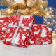 Eine Winterurlaubsverpackung mit einem weißen Rentiermuster in einem Waldwald mit Silhouette auf einem roten Hintergrund.