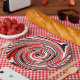 Rot-weiß-schwarz-psychedelisch gestaltete Papiertafel