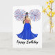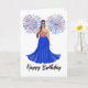 Amerikanische Unabhängigkeitstag-Illustrationen mit großen Feuerwerken in der Hintergrund Geburtstagskarte. Niedlich und weiblich zeichnend einer Frau in einem gestreiften Shirt und einem langen blauen Rock. Sie trägt auch eine blausternförmige Sonnenbrille. Niedliches und einzigartiges 4. Juli Design für den Sommer. Diese Karte kann für Juli Geburtstage verwendet werden. Fügen Sie eine spezielle Nachricht hinzu.