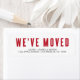 Rot "Wir haben uns bewegt" in einem fett gedruckten Schriftart mit den unten angegebenen Namen und Adressen