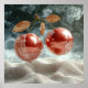 Zwei glänzende, rote Äpfel, die in der Luft hängen und durch einen schlanken Stamm verbunden sind. Jeder Apfel ist teilweise in klarem Wasser getaucht, Tröpfchen und Blasen fangen das Licht schön ein. Die Äpfel sind mit zarten, metallischen Blätter geschmückt, die eine elegante Touch verleihen. Im Hintergrund ergänzt ein weicher, raucher Farbverlauf die Szene, während die Oberfläche darunter glattem, sandigem Gelände ähnelt, das mit Feuchtigkeit funkelt. Die Gesamtkomposition vermittelt ein Gefühl von Frische und künstlerischer Schönheit.