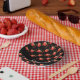 Rote Äpfel und Blätter auf schwarz Pappteller