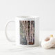 Impressionistisches Mischmedienbild einer Bucht, die von Sheryl Karas durch den sonnigen Rand eines Waldes mit weißem Baumbestand verläuft.