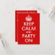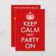 Anpassbare Textbereiche auf einer rot-weißen Parodie "Behalt Calm and Party On" für eine Geburtstagsparty.