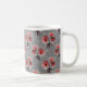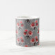 Rote Blume auf grauem Hintergrund mit weißen Polka-Punkten.