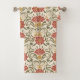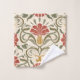 Elegante Blumenhandtücher mit einem symmetrischen Design mit roten Blumen, grünen Blättern und gelben Akzenten. Werden hängend und gefaltet dargestellt und vermitteln einen vintage Stil.