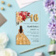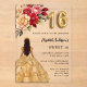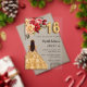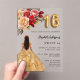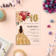 Eine moderne, stilvolle und glamouröse Einladung zu einer Sweet 16, 16 h Geburtstagsfeier. Ein klarer, transparenter Hintergrund, ein Mädchen mit goldenem Kleid und roten, rosa und goldenen Rose, Blumen. Der Name ist mit einem modernen handgeschriebenen Stilskript geschrieben. Personalisieren Sie Ihre Party-Daten und fügen Sie sie hinzu.