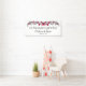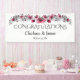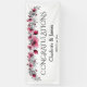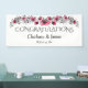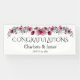 Fügen Sie dieses hängende Banner zu Ihrem Hochzeitsempfangszubehör hinzu. Der Text ist in hellen Farbtönen von Cranberry Red gestaltet, mit dunklen, blumengeschmückten Ästen auf weißem Hintergrund. Er beinhaltet: GRATULATIONS und die ersten Namen von Braut und Groom. Um Ihre persönlichen Wünsche zu erfüllen, tauschen Sie einfach das Muster Bride und Groom's Names aus.