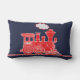 Hellrotes Puffdampf-Zug Jungs Kissen. Personalisieren Sie mit Ihrem eigenen Namen, liest derzeit Daniel und Daniel auf Kesselplatte. Teil des grafischen Dampfleitenprogramms. Die Hintergrundfarbe kann auch auf Ihre eigene Farbwahl geändert werden, die derzeit in dunkelblau angezeigt wird. Ein perfektes Geschenk für Jungen, um zur Schule zu gehen oder als Geschenk an einen Zug, einen Fan des Eisenbahnverkehrs oder einen Modelleisenbahnfreund. Original Dampfzug Grafik und Design von Sarah Trett exklusiv für www.mylittleeden.com auf zazzle.