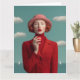 Ein auffallendes Porträt einer rot-haarigen Frau in einem kühnen roten Outfit, das einen roten Apfel gegen einen traumhaft türkisfarbenen Himmel hält. Ihr Vintager Hut und ihre lebendigen roten Lippen verstärken die surreale, hochmodische Ästhetik. Ideal für Werbe-, Redaktions- oder Branding-Visuals.