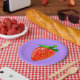 Sehr Juicy Red Strawberry auf lila Hintergrund. Pop Art.