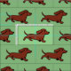 Rote glatte Dackel-laufendes Moos-Grün-Gewebe. Ein entzückender roter glatter behaarter Dackelwelpe läuft mit Twinkleaugen. Heitre und launische und lustige Hundekunst geschaffen von Naomi Ochiai von Japan. Niedlicher Dackel-Cartoonentwurf für Hundeliebhaber die Liebe Dackel!!