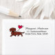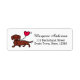 Rote, glatte Dackel Lächelnde Herz-Rücksendeadressen-Aufkleber für Dackel-Fans. Niedlicher Hund Cartoon von Naomi Ochiai aus Japan. Dackel liefert jemandem eine Rote Rose.