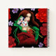Eine farbenfrohe Frau mit einer Venezianischen Maskeratmaske, die rot und grün in einem schwarzen Hintergrund mit roten und violetten Blumen trägt