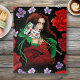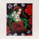 Eine farbenfrohe Frau mit einer Venezianischen Maskeratmaske, die eine rote und grüne Maske trägt, in einer schwarzen Umgebung mit roten und violetten Blumen