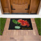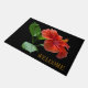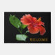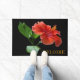 Rote Hibiskus-Tür-willkommene Matte Mailands. Gezeigt in der größten Größe. Zusammenpassendes willkommenes Holzkistezeichen und -kissen verfügbar.