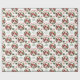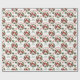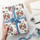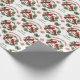 Das wiederholte Muster dieses Weihnachtsverpackungspapiers enthält ein Bild von zwei roten Kardinal-Vögeln, die auf einem in einem roten Traubenkranz angebrachten Kranz stehen. Roter, gekrümmter Text sagt "Frohe Weihnachten" an der Spitze des Kranzes, mit der eigenen Unterschrift in Grün darunter. Andere Bilder im Muster sind festliche Bögen und dekorative Sterne.