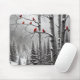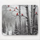 Rote Kardinäle stehen auf schneebedeckten Ästen in einem winterlichen Wald mit Schneeflocken