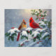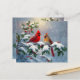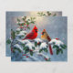 Ein Paar nördliche rote Kardinäle stehen auf einem heiligen Ast mit roten Beeren und Schnee bedeckt.