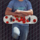 Von oben aus hat man einen Blick auf frische rote Kirschen, die auf einer weißen Oberfläche verstreut sind. Die saubere Komposition und der helle Farbkontrast schaffen eine minimalistische und elegante Sommerästhetik, ideal für Lebensmittelblogs, Küchendrucke oder Verpackungsdesign.