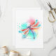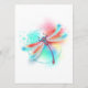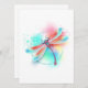 Rot, fliegend, künstlerisch gezeichnet, in hellen Farben mit texturiertem Schöpferdchen, blaue Flügel auf weißem Hintergrund, überstrichen mit Aquarellmalerei. Helle rote Libelle.