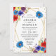 Elegante Boho Wasserfarbe Rot, Lila und Blau Sommer Blume Blume und Foliage-Design mit goldgeometrischen Rahmen