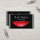 Eine trendige, rot-schwarze Make-up-Visitenkarte mit glitzernden roten Lippen auf schwarzem Hintergrund, gerahmt mit modernen schwarz-weißen Streifen in diagonaler Richtung. Personalisieren Sie das durch den Namen des zertifizierten Kosmetologen oder Kosmetologen.
