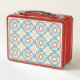 Rote Lunchbox mit einem vintage Blumenfliesen-Muster mit blauen, orangen und weißen Farben auf der Vorder- und Rückseite, das eine retro- und cheerful-Atmosphäre ausstrahlt.