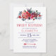 Rustikales, elegantes 16 . Geburtstag-Party Einladung-Template mit einem böhmischen, roten, bordeauxroten und rot-rosafarbenen Bouquet mit dunkelblauem Blattwerk, Federn und Schriftzeichen. Füllen Sie Ihre Informationen in den Flecken, Sie können wählen, um es anzupassen, weitere sich ändernde Schriftartes, die Farben der Schrift oder den Hintergrund hellrot auf der Rückseite. — Die Einladung ist für den Frühling oder Sommer geeignet | rustikales Land | elegante Blüte | Garten moderne süße 16 oder andere Geburtstags Meilensteine Party. — Wenn Sie Hilfe beim Design benötigen, kontaktieren Sie mich bitte!