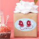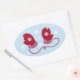 Ein niedliches Paar roter Fäuste auf einer roten Saite. Ein weicher, blauer Hintergrund mit kleinen weißen Schneeflocken, die umtanzen.